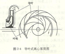 2)導(dǎo)葉式泵——在葉輪外圍安有幾個固定導(dǎo)葉片的泵即為導(dǎo)葉式泵(圖2-4)。在早期,這種泵叫透