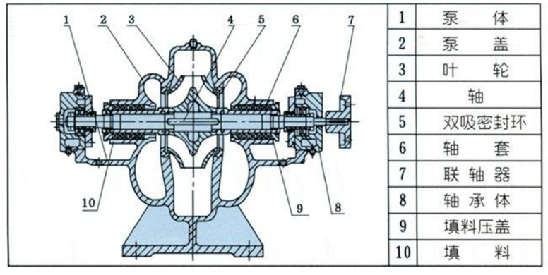 單級雙吸泵的基本結(jié)構(gòu)由以下幾個部分組成: